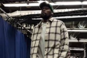 迎火箭常规赛首秀&战旧主雷霆!杜兰特格子上衣+鸭舌帽帅气到场