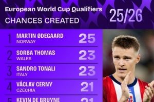 体育资讯10月15日讯 据Squawka统计,厄德高是本届欧洲世预赛创造机会最多的球员。